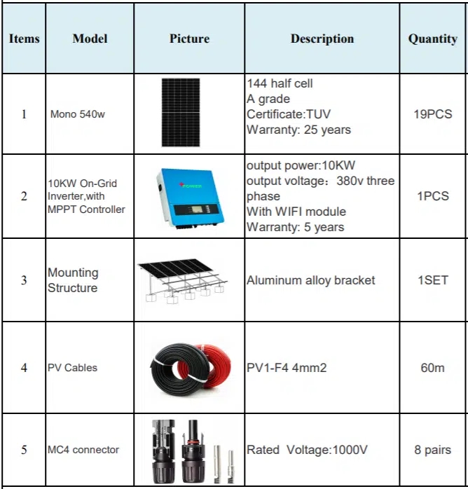 A 10KW on-grid solar system typically consists of several key components and equipment to generate electricity from sunlight and feed it into the electrical grid. Here are the main parts included in such a system: