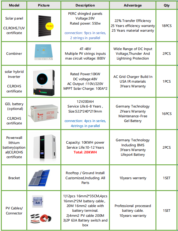 The specific components of a Plus Power 10KW off-grid solar system may vary depending on the manufacturer and system design. However, here are the common parts that are typically included in a 10KW off-grid solar system: